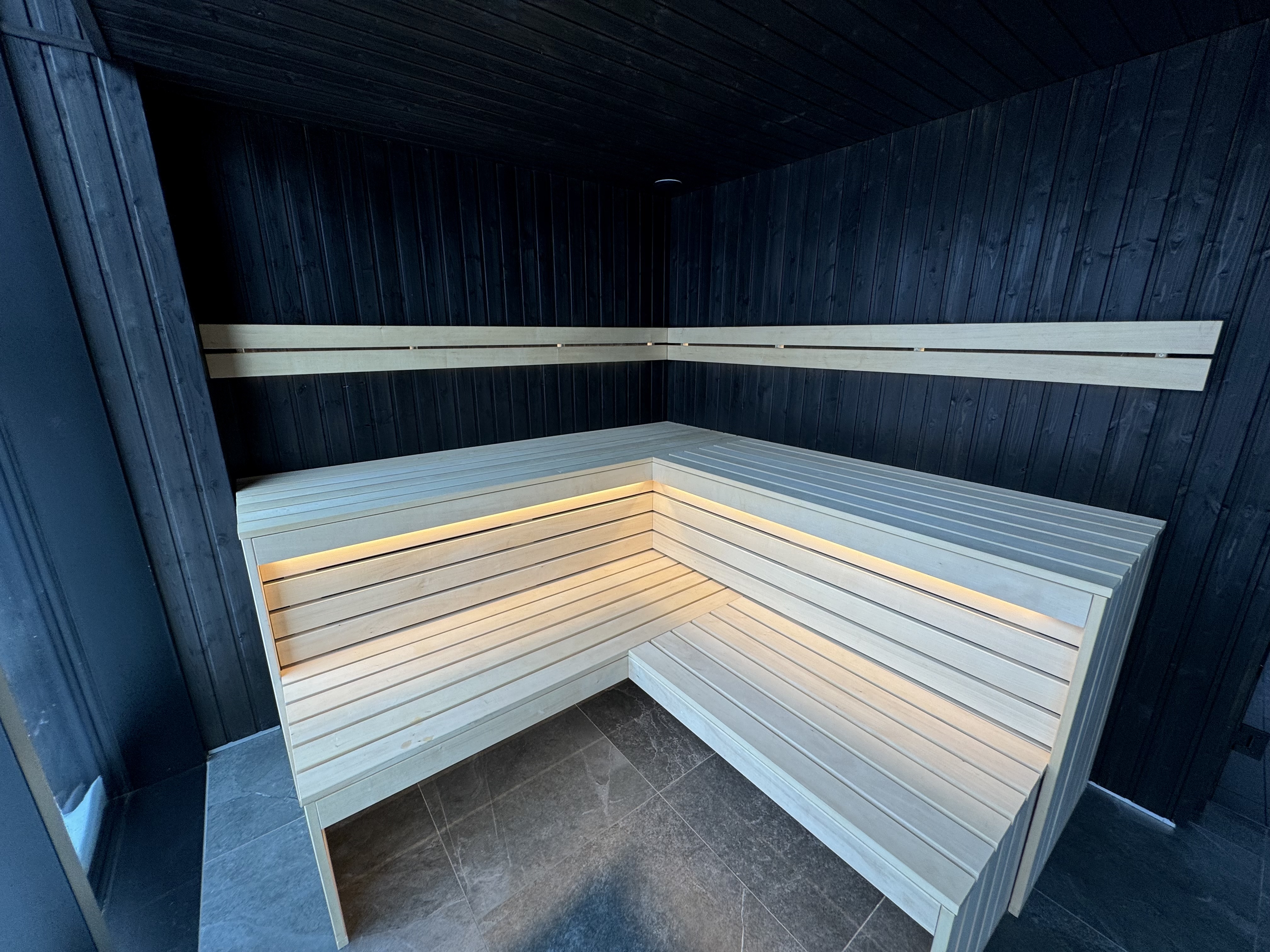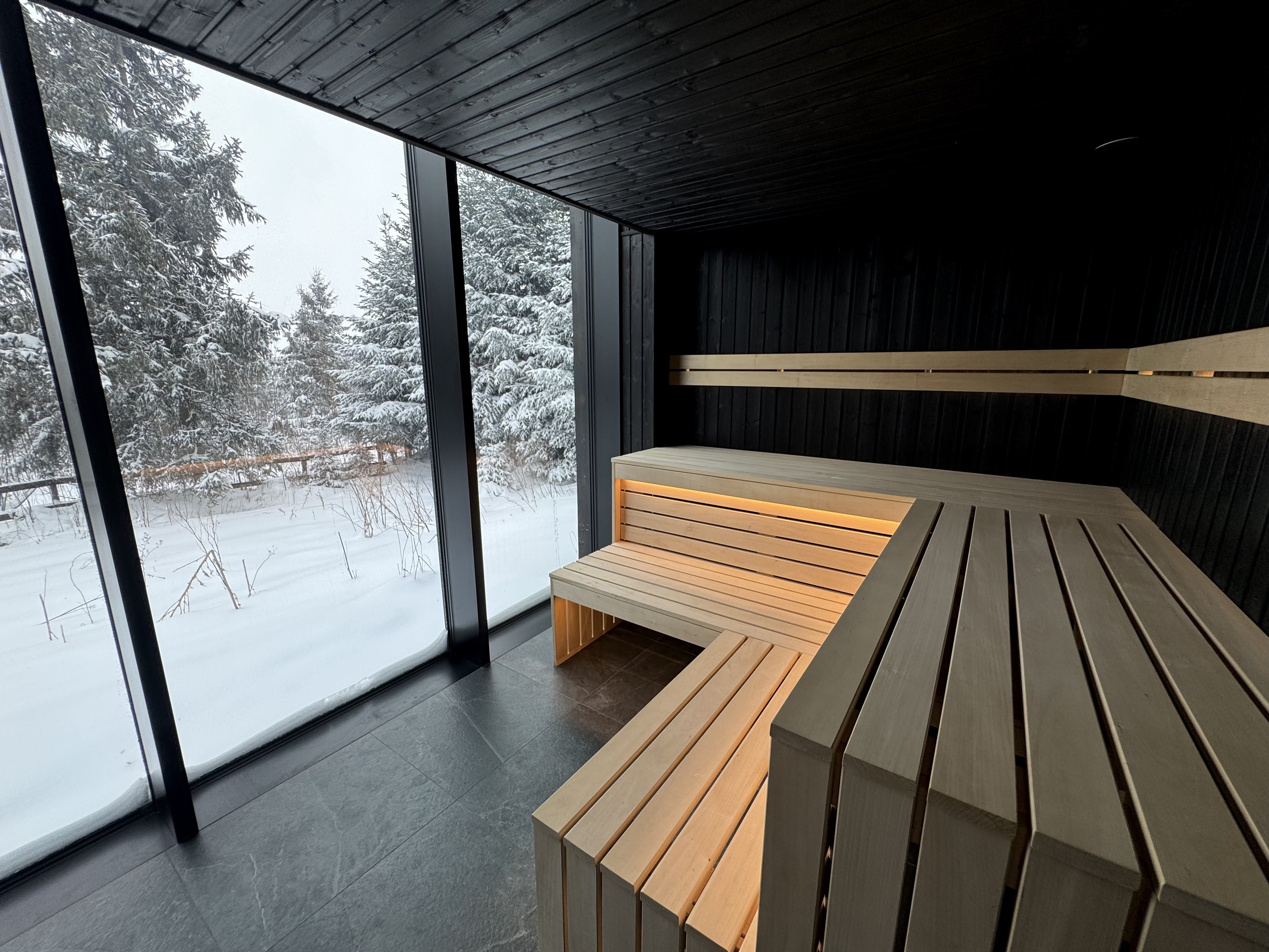 W hotelu Slow Tatry Zakopane byliśmy odpowiedzialni za realizację wewnętrznej strefy SPA, której jednym z kluczowych elementów była sauna sucha. Inwestorzy, nawiązując do charakteru i designu obiektu, postawili na dwukolorową aranżację: ściany i sufit z malowanego na czarno świerku oraz ławki z bardzo jasnego drewna lipowego.
