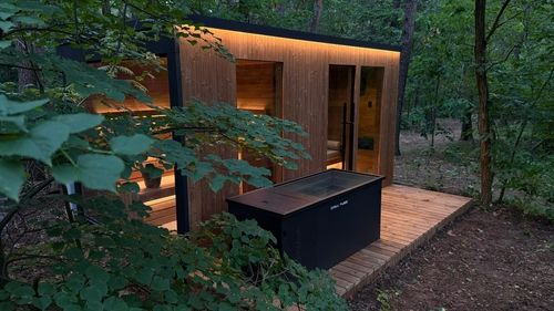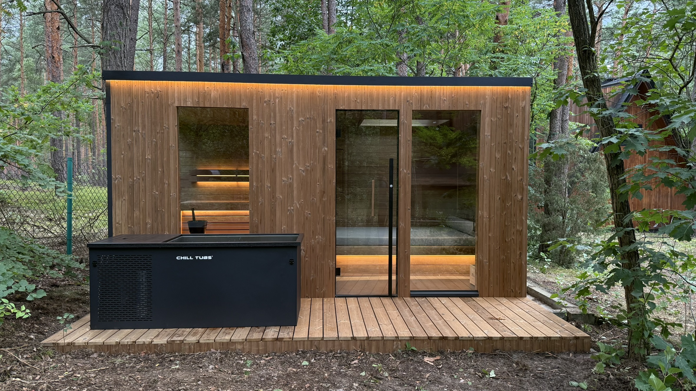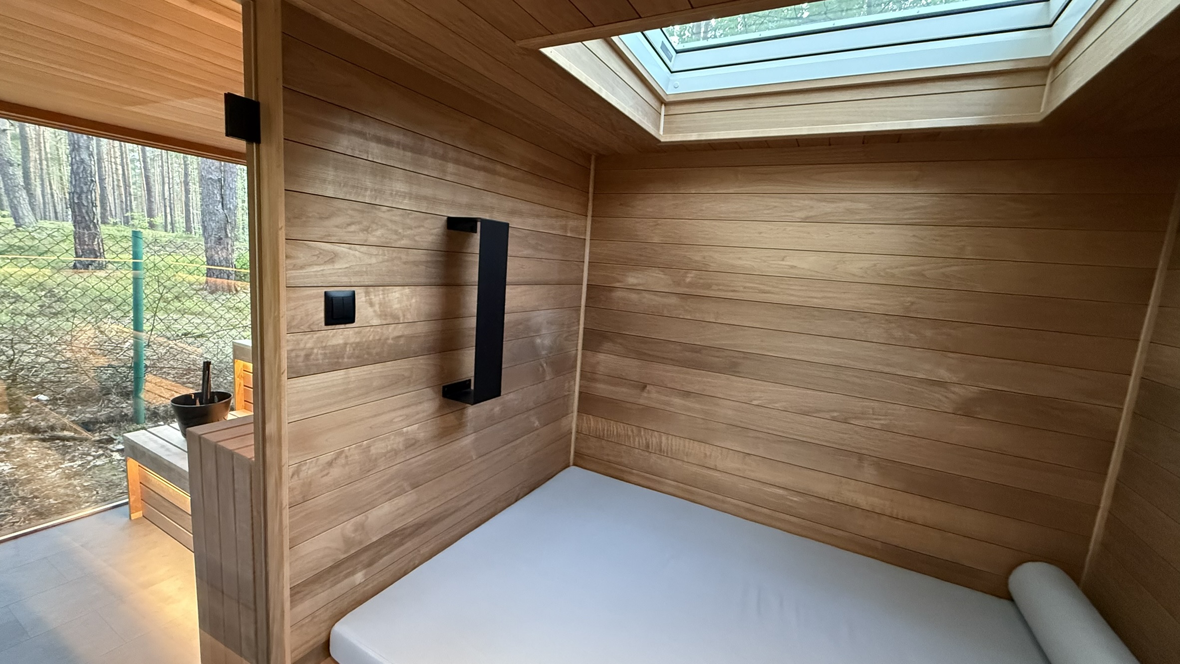 W przedsionku znalazła się wygodna leżanka, a wnętrze sauny wykończono drewnem osikowym, tworząc jasną i naturalną przestrzeń. Do zestawu dołożono wannę do morsowania Chill Tubs Original, zapewniając możliwość kontrastowych terapii — gorąca sauna + zimna kąpiel.