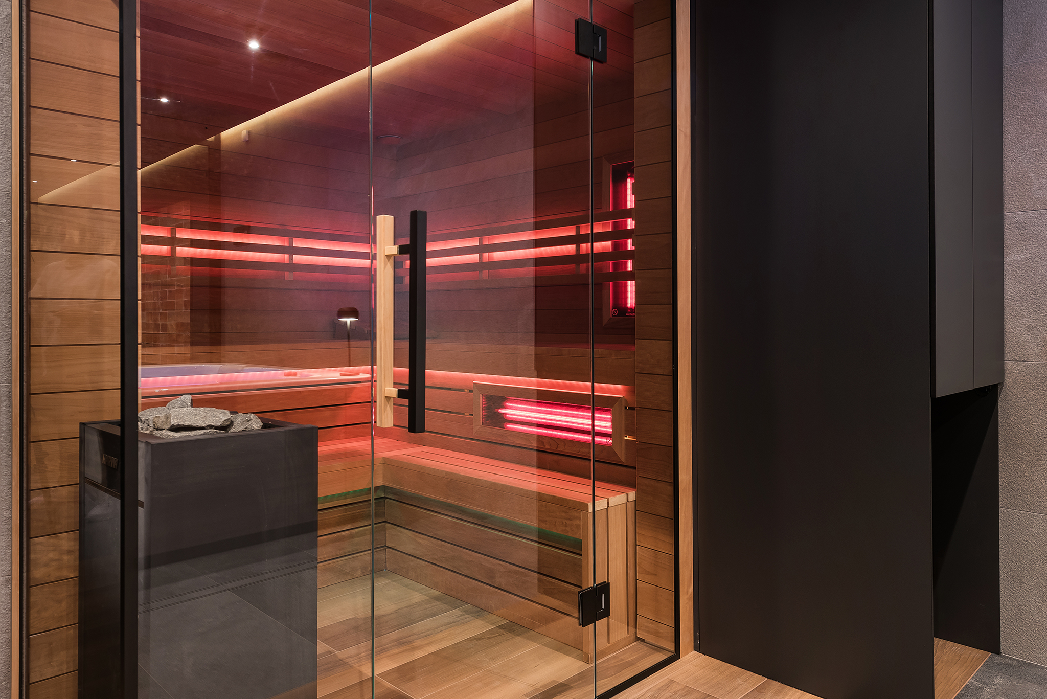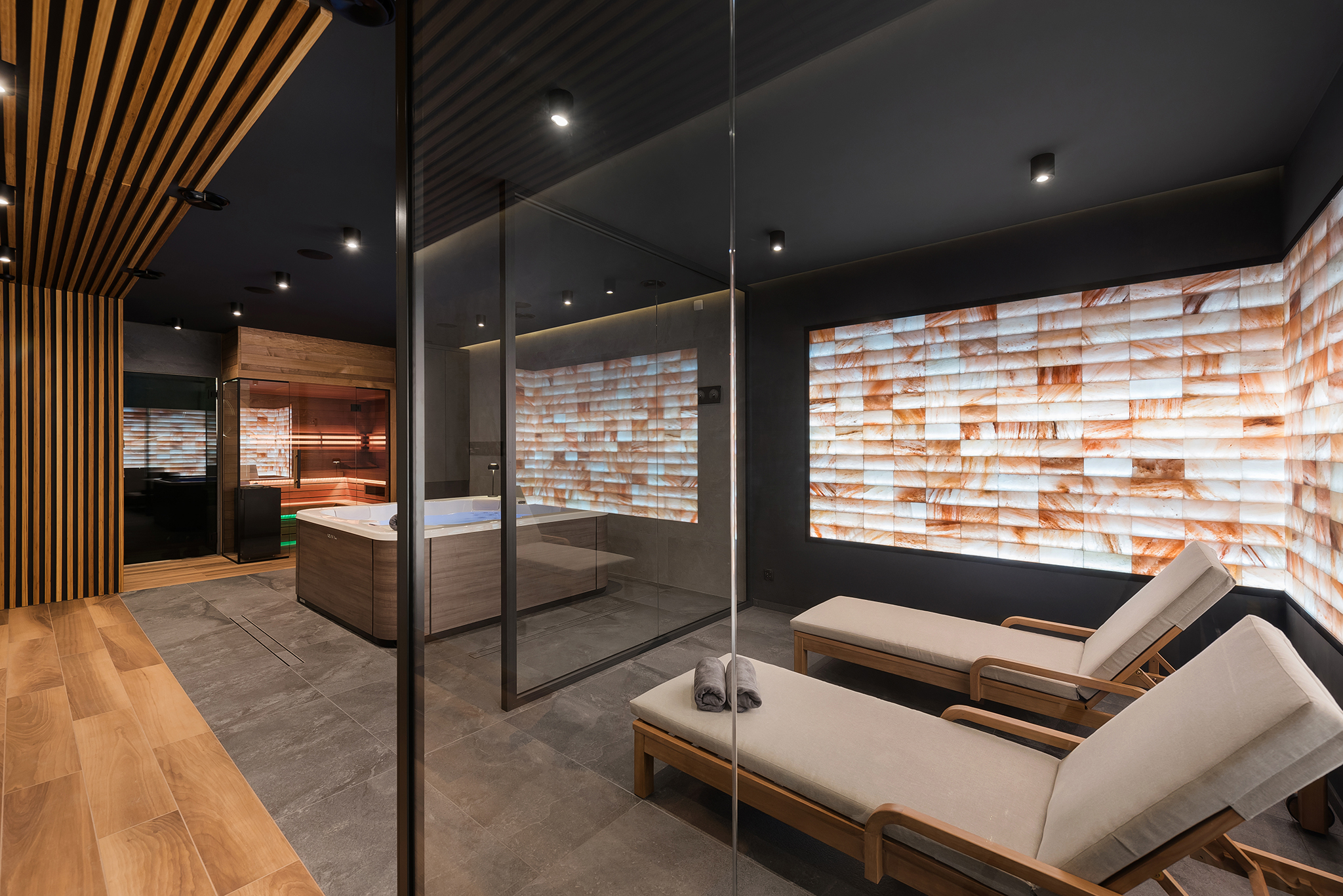 W tej wyjątkowej przestrzeni znalazła się wanna spa, sauna sucha z promiennikami infrared z drewna Osika Termo, strefa z leżakami oraz podświetlaną ścianą solną. Dodatkowo prysznic i łazienka dopełniają całości. Całość wykończona materiałami ceramicznymi Modulartem Pool.