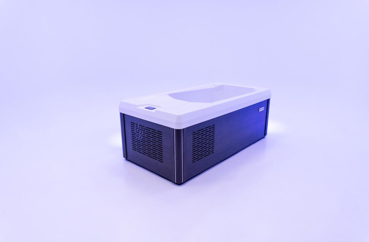 Pojemność ok. 700 litrów oraz dłuższa niecka pozwalają na swobodne zanurzenie całego ciała, a mocny agregat utrzymuje wodę nawet na poziomie 3°C lub – w trybie grzania – do ok. 40°C, bez konieczności używania lodu.